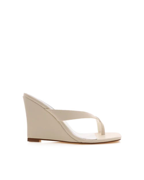 Wyley by Billini is a modern high wedge. Sleek and minimally designed, this wedge will be on high rotation all year round. Featuring; high low-profile wedge open square toe soft padded footbed thick thong style upper slip on design synthetic lining and outsole Available in Black, Bone and Desert. Heel height 9.5cm.