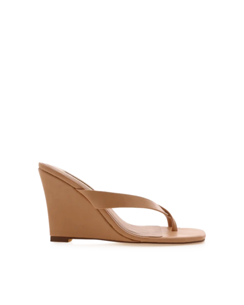 Wyley by Billini is a modern high wedge. Sleek and minimally designed, this wedge will be on high rotation all year round. Featuring; high low-profile wedge open square toe soft padded footbed thick thong style upper slip on design synthetic lining and outsole Available in Black, Bone and Desert. Heel height 9.5cm.